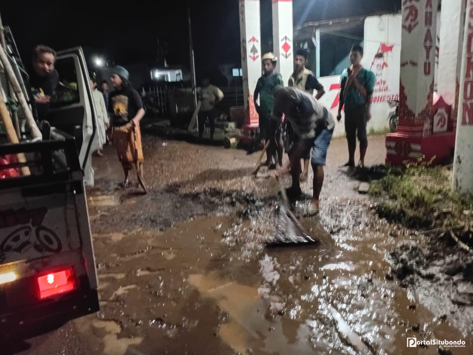 Semangat gotong royong tampak begitu kuat di tengah masyarakat. Pada Senin malam, 9 Maret 2026 sekitar pukul 23.15 WIB, kegiatan kerja bakti masih berlangsung di beberapa titik desa. Warga bersama relawan terlihat bahu-membahu membersihkan lumpur yang menutup badan jalan, terutama di sekitar Jalan Joko Tole yang menjadi salah satu jalur penting bagi aktivitas masyarakat.
