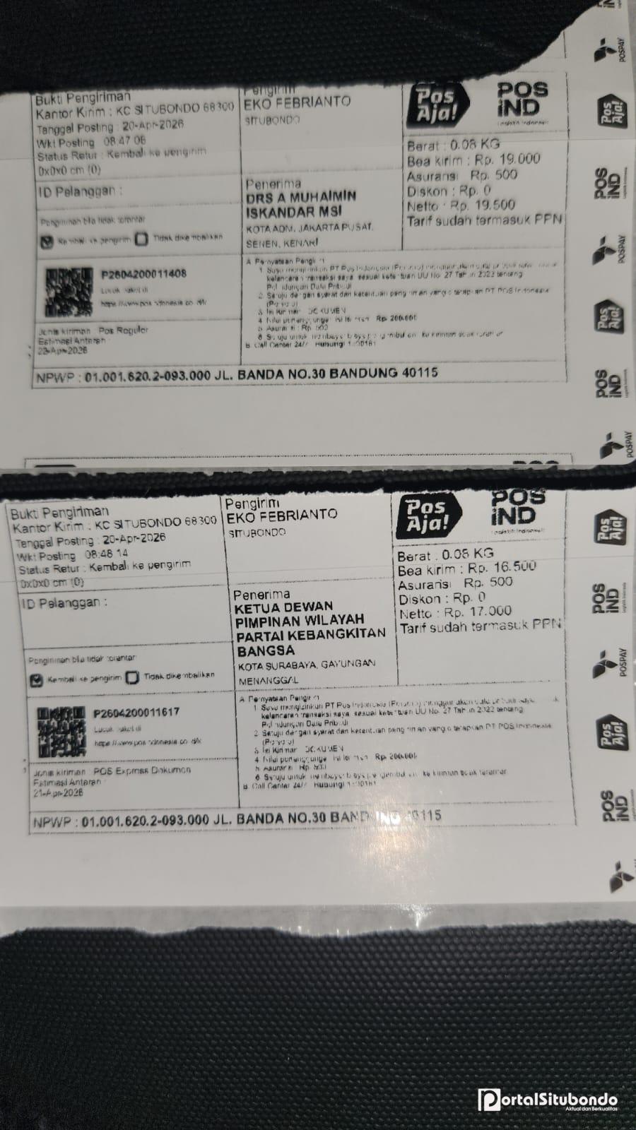 Ini Resi Pengiriman Surat laporan Ke DPP PKB Jakarta Dan DPW PKB di Surabaya.
