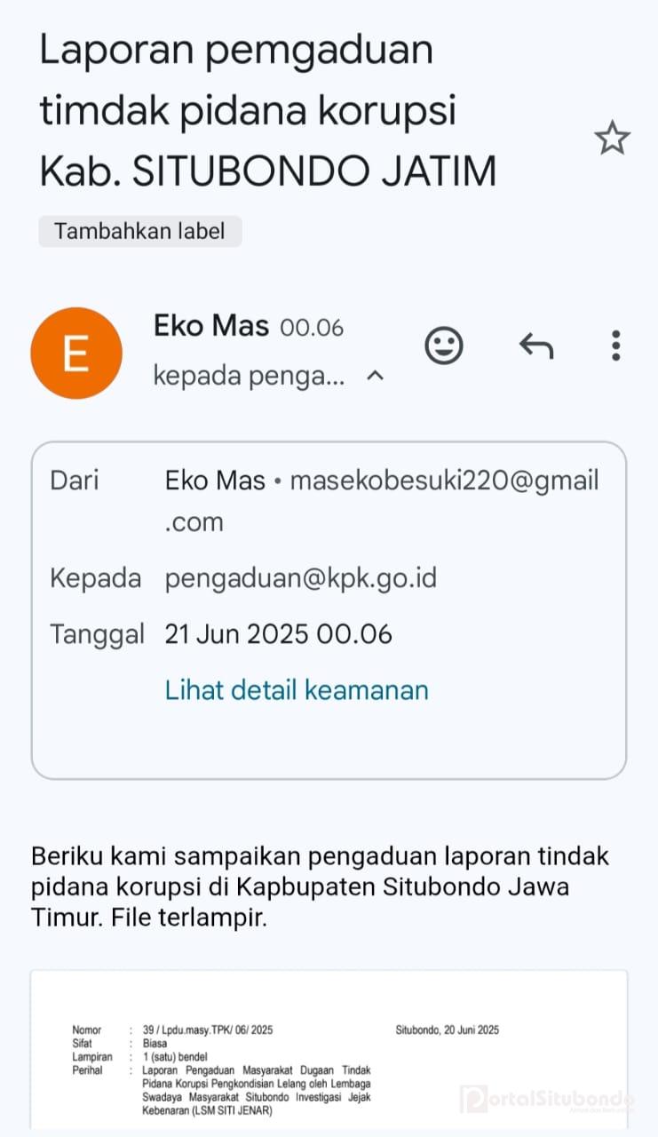 Portalsitubondo.com Situbondo, 20 Juni 2025: Sebuah laporan pengaduan resmi yang dilayangkan oleh Lembaga Swadaya Masyarakat Situbondo Investigasi Jejak Kebenaran (LSM SITI JENAR) kepada Komisi Pemberantasan Korupsi (KPK) mengguncang jagat birokrasi lokal di Kabupaten Situbondo. Melalui laporan bernomor 39 / Lpdu.masy.TPK/ 06/ 2025, organisasi masyarakat sipil ini mengungkap dugaan praktik pengkondisian tender proyek pengadaan barang dan jasa pemerintah yang melibatkan aktor di luar struktur resmi pemerintahan, namun memiliki pengaruh sangat besar terhadap hasil lelang.