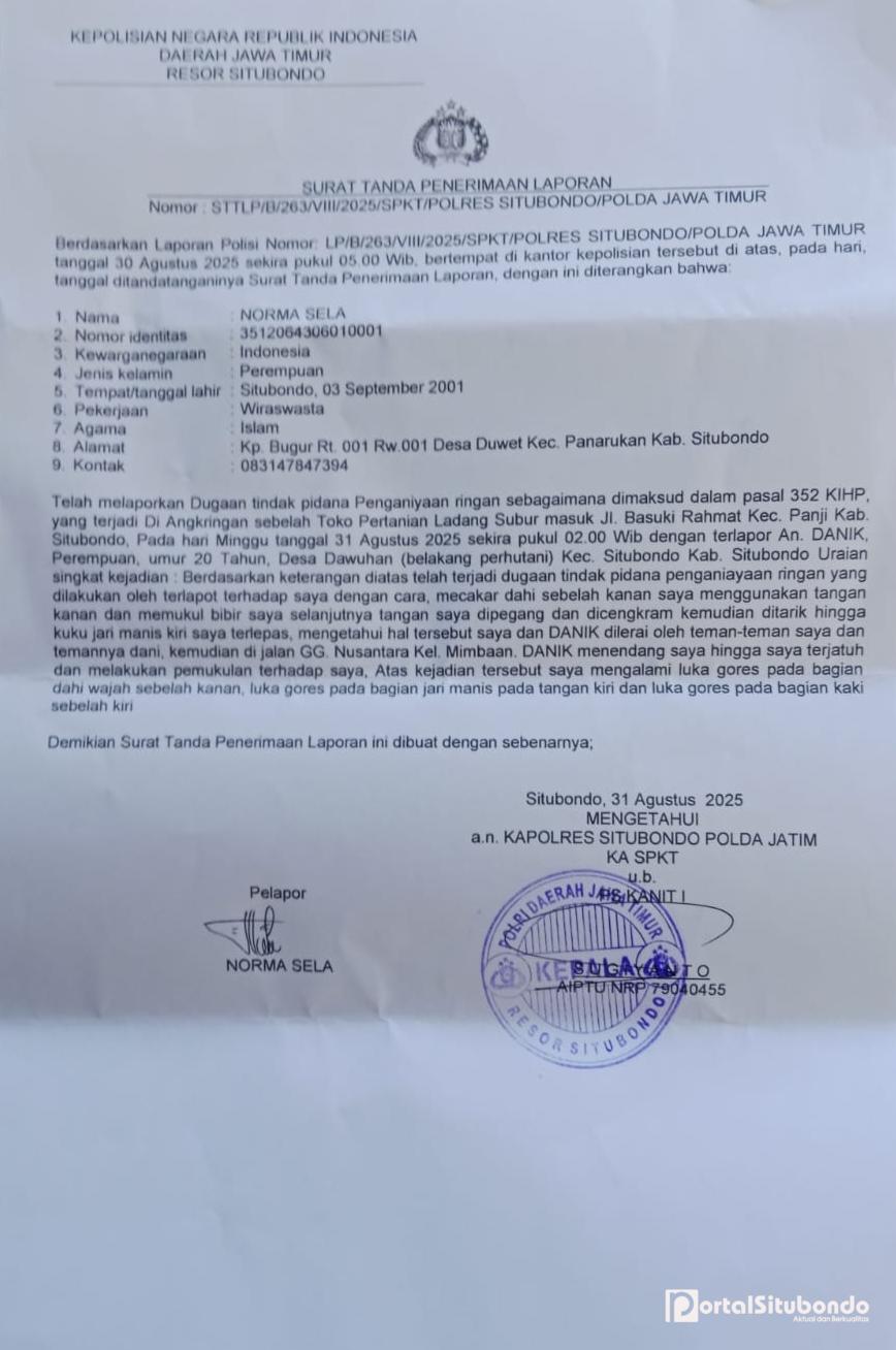 PortalSitubondo.com Senin Senin, 1 September 2025: Kasus dugaan penganiayaan kembali menimpa salah satu warga masyarakat Panarukan – Situbondo. Seorang perempuan muda, Norma Sela (23), warga Desa Duwet, Kecamatan Penarukan, harus mendapatkan perawatan intensif di rumah sakit setelah diduga menjadi korban kekerasan oleh seorang pelaku yang juga seorang wanita berinisial DN, warga Kelurahan Dawuhan.