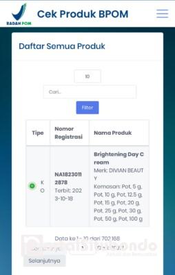 Produk pelembap ini mencantumkan nomor notifikasi NA18230112878 yang, setelah ditelusuri, bukanlah milik produk tersebut, melainkan terdaftar atas nama Divian Beauty.