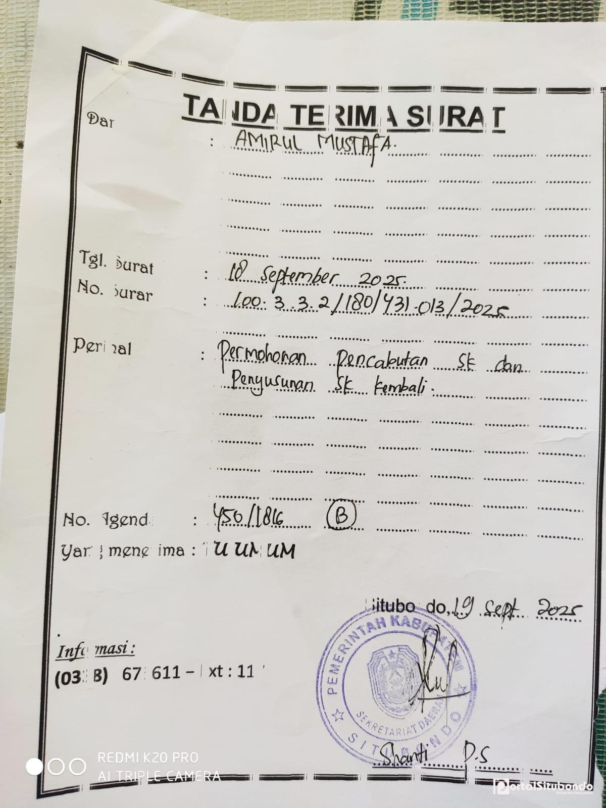 Keterangan Fhoto: tanda Terima surat Permohonan Keberatan kepada Bupati Situbondo
