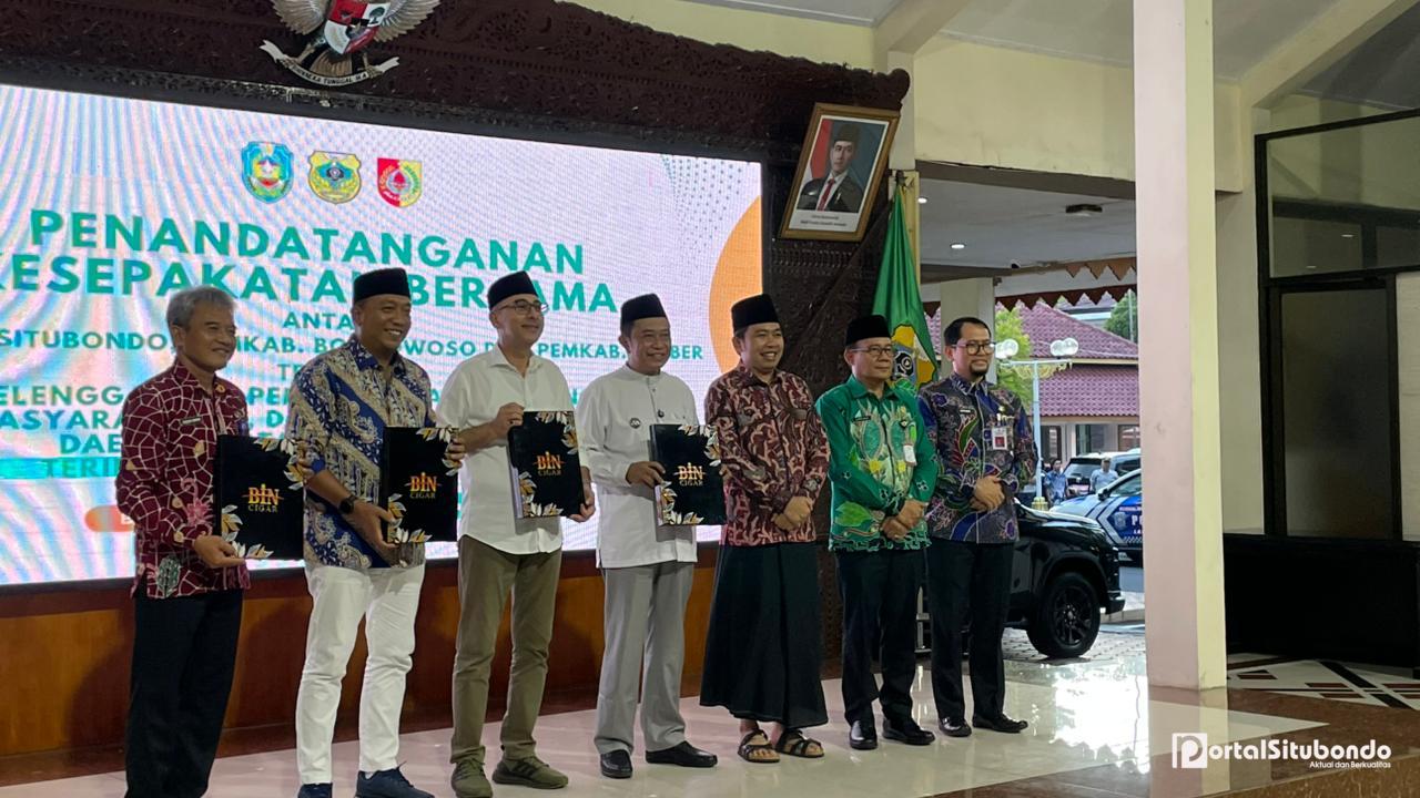 Portalsitubondo.com Bondowoso, Jawa Timur – Kamis, 16 Oktober 2025: Langkah bersejarah diambil oleh tiga kepala daerah di kawasan timur Jawa Timur. Bupati Situbondo Yusuf Rio Wahyu Prayogo, Bupati Bondowoso Abdul Hamid Wahid, dan Bupati Jember Muhammad Fawait secara resmi menandatangani Kesepakatan Aglomerasi Kawasan Tapal Kuda di Pendopo Raden Bagus Asra, Kabupaten Bondowoso. Penandatanganan ini menjadi momentum penting dalam memperkuat kolaborasi antardaerah guna mempercepat pertumbuhan ekonomi, memperluas lapangan kerja, serta mempererat konektivitas antarwilayah.