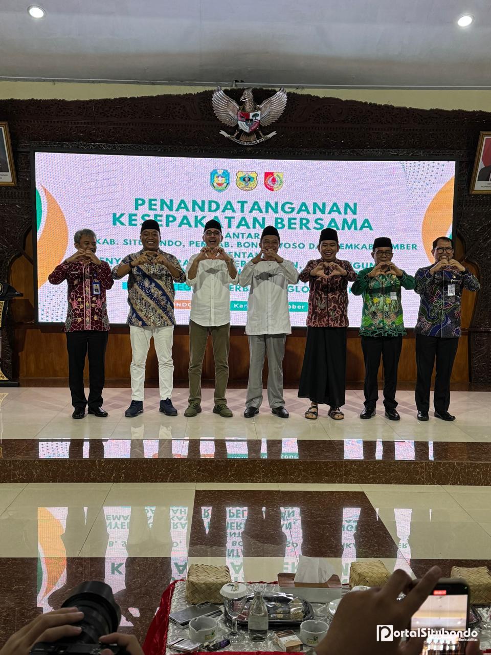 Portalsitubondo.com Bondowoso, Jawa Timur – Kamis, 16 Oktober 2025: Langkah bersejarah diambil oleh tiga kepala daerah di kawasan timur Jawa Timur. Bupati Situbondo Yusuf Rio Wahyu Prayogo, Bupati Bondowoso Abdul Hamid Wahid, dan Bupati Jember Muhammad Fawait secara resmi menandatangani Kesepakatan Aglomerasi Kawasan Tapal Kuda di Pendopo Raden Bagus Asra, Kabupaten Bondowoso. Penandatanganan ini menjadi momentum penting dalam memperkuat kolaborasi antardaerah guna mempercepat pertumbuhan ekonomi, memperluas lapangan kerja, serta mempererat konektivitas antarwilayah.